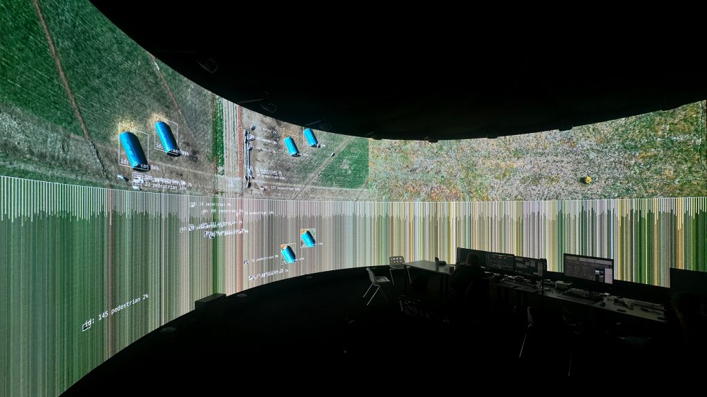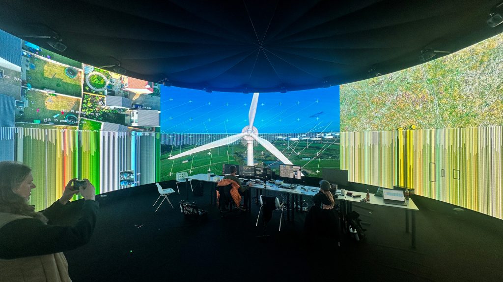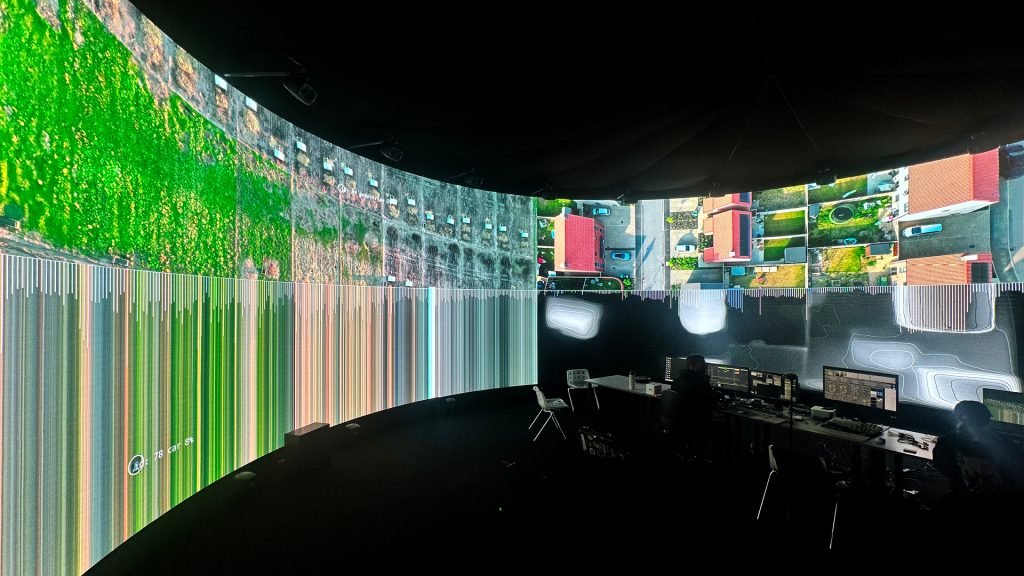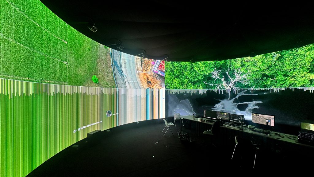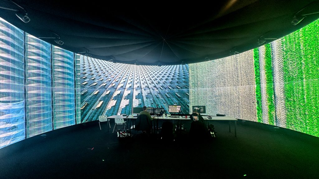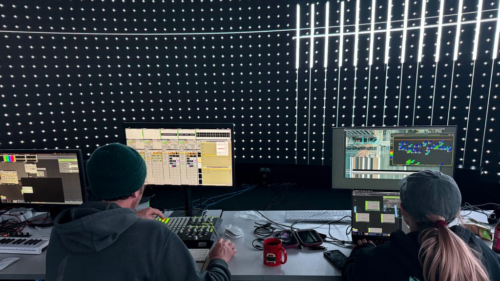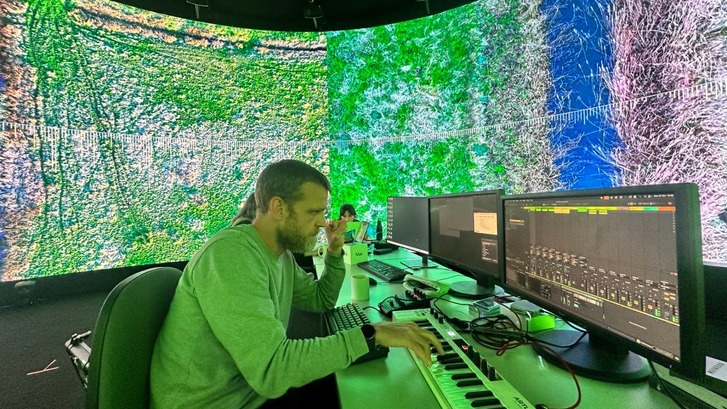 The research opened up lots of new learning, using Claude AI to code shaders, integrate Touch Designer plugins and controls into VDMX. The team discovered how to build MaxMSP patches that used NDI video streams from VDMX and Touch Designer to drive musical compositions, and to root these audio and visual streams into the immersive IVSL system in real-time.