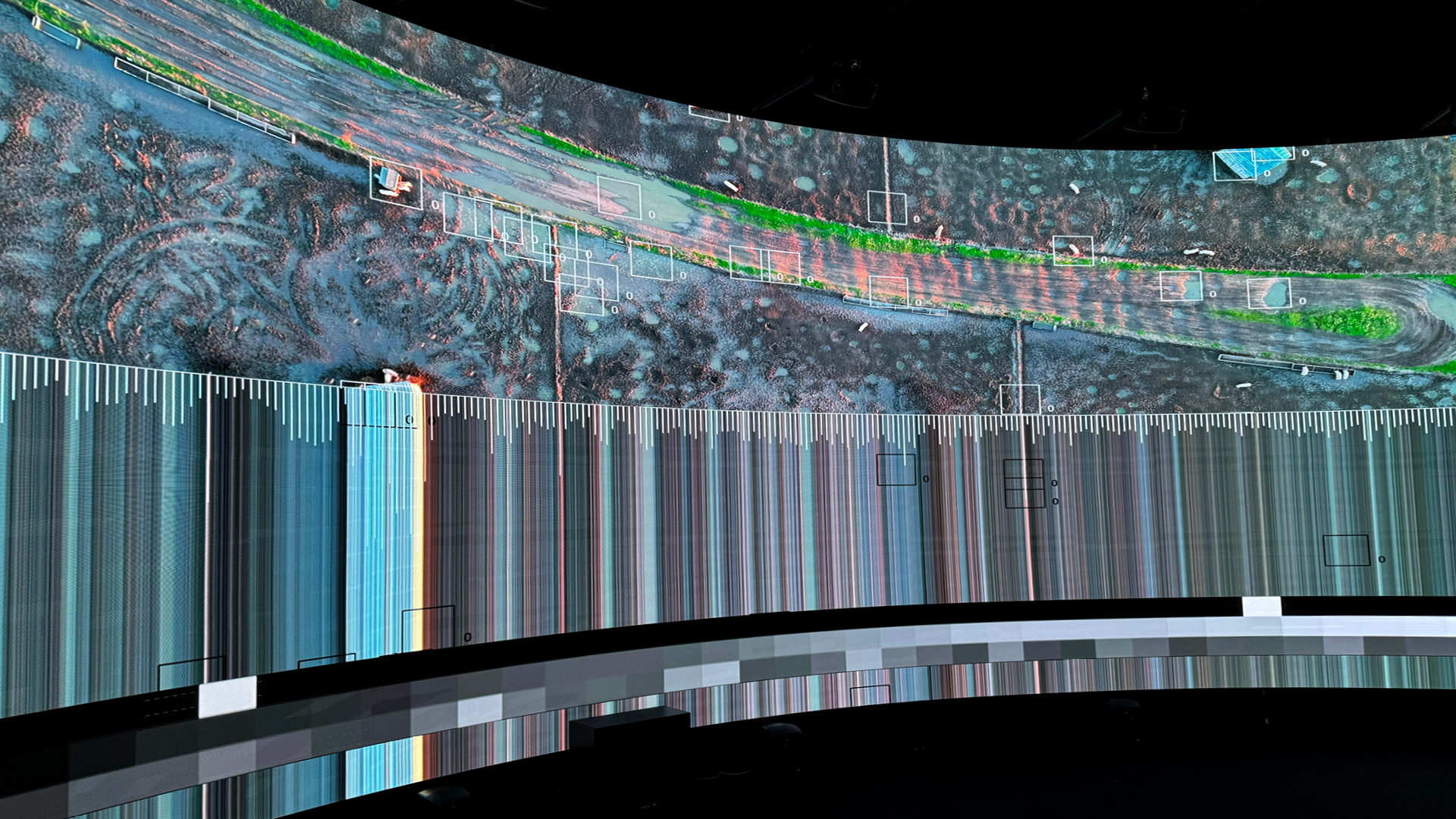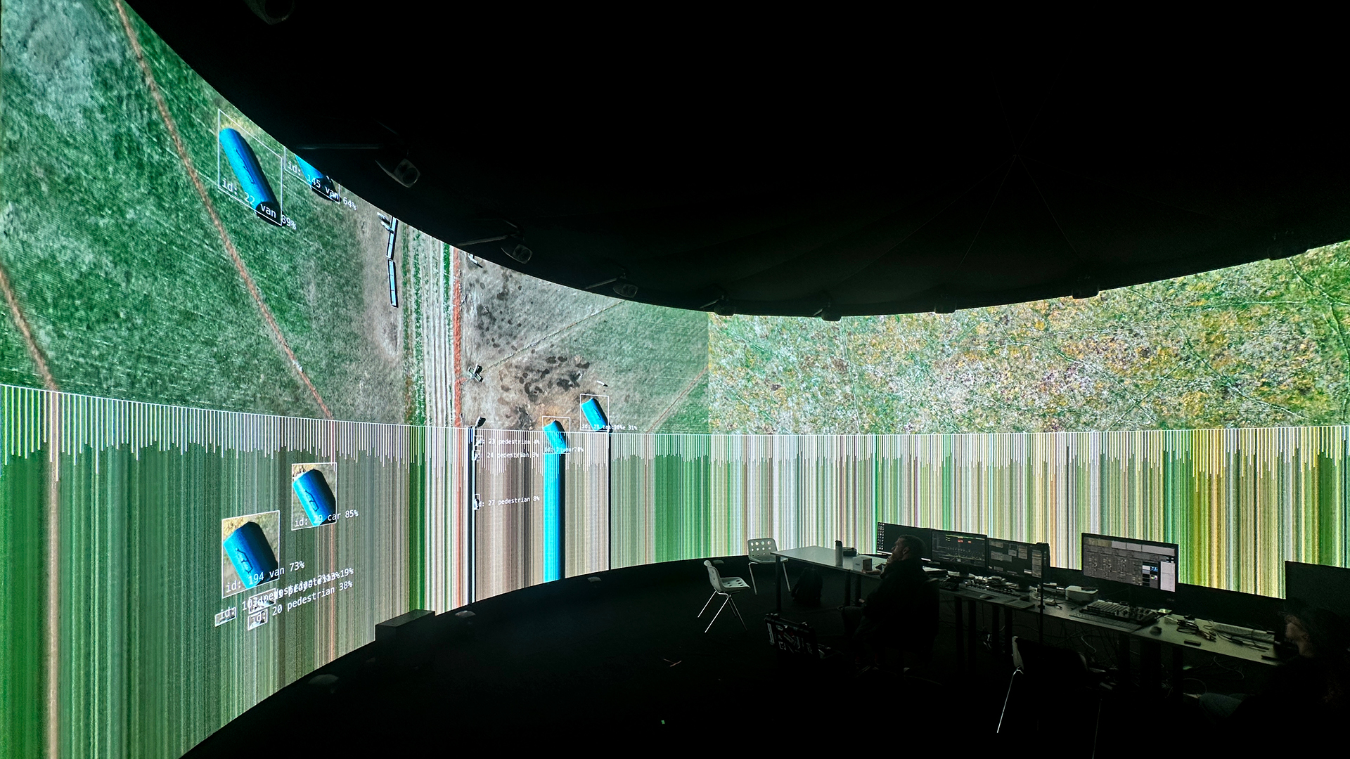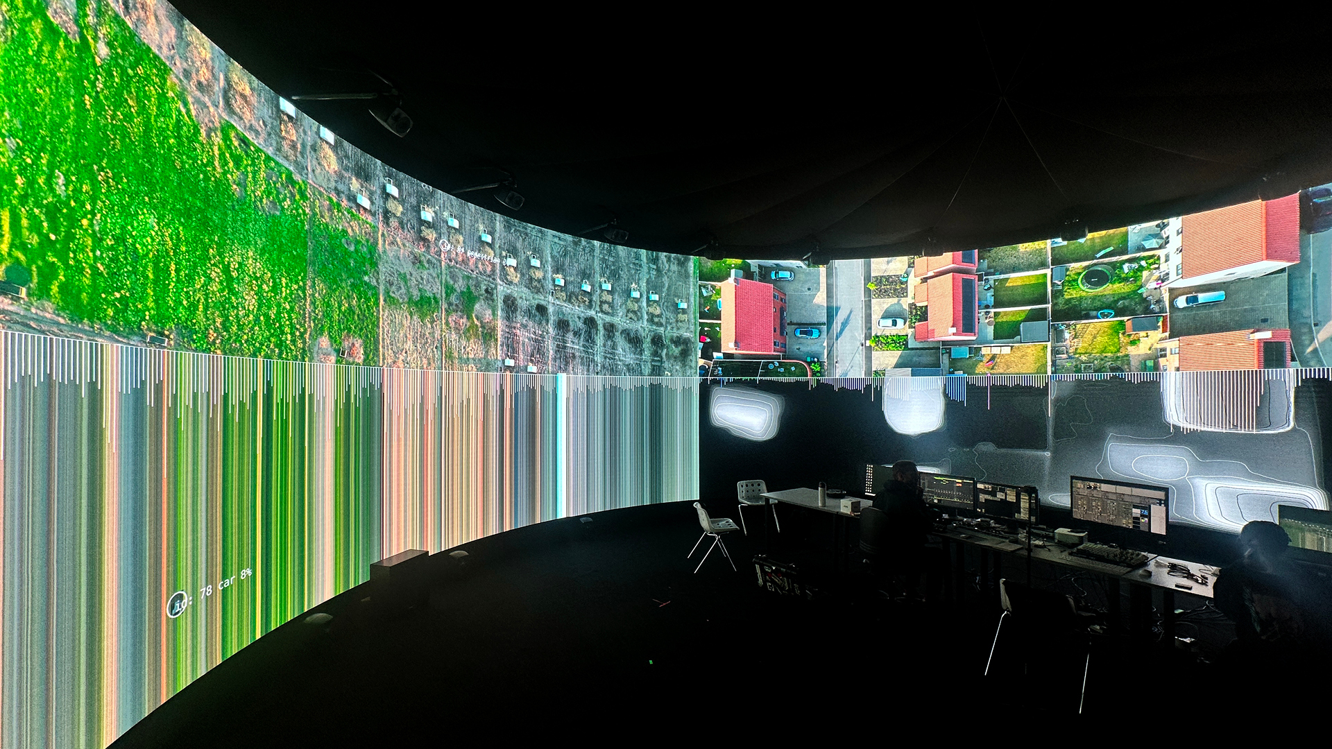 – VDMX and TouchDesigner were used to process the aerial footage and to perform different techniques, including depth mapping, blob tracking and extracting different real-time visual data (brightness, movement, colour temperature) that was sent as data to an Ableton. Both software platforms were also used to explore different visualisations of this process to give audience feedback.