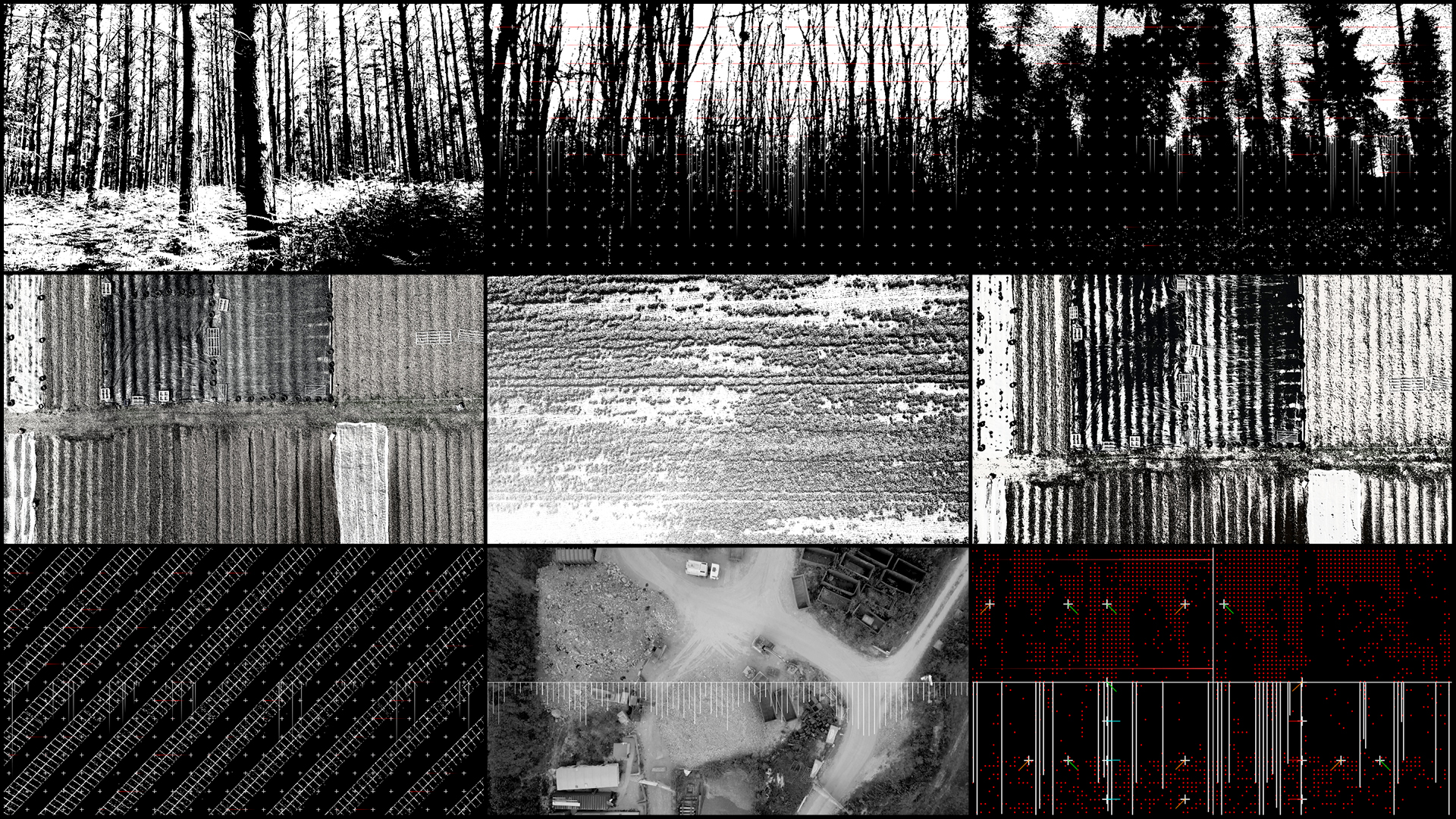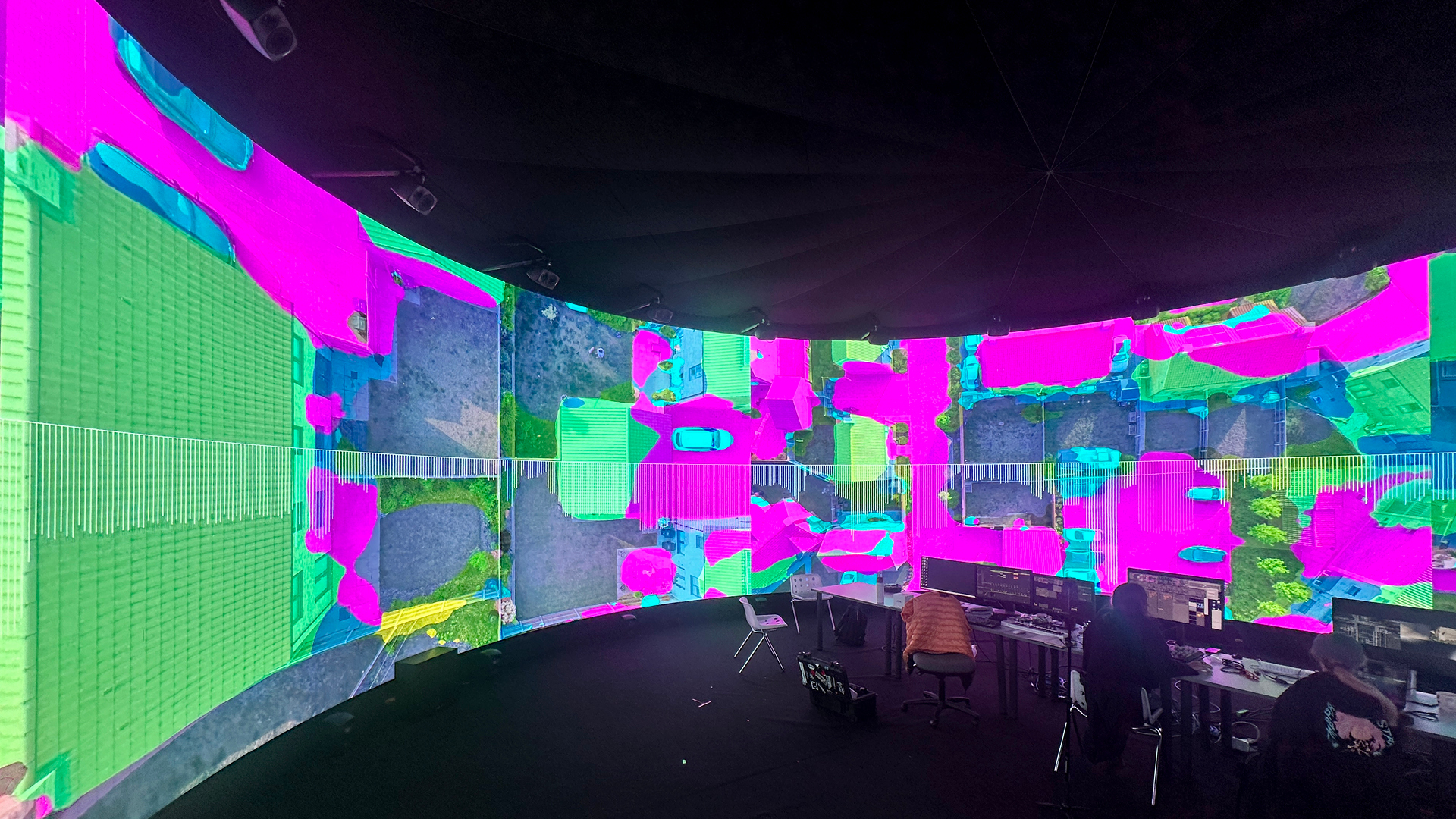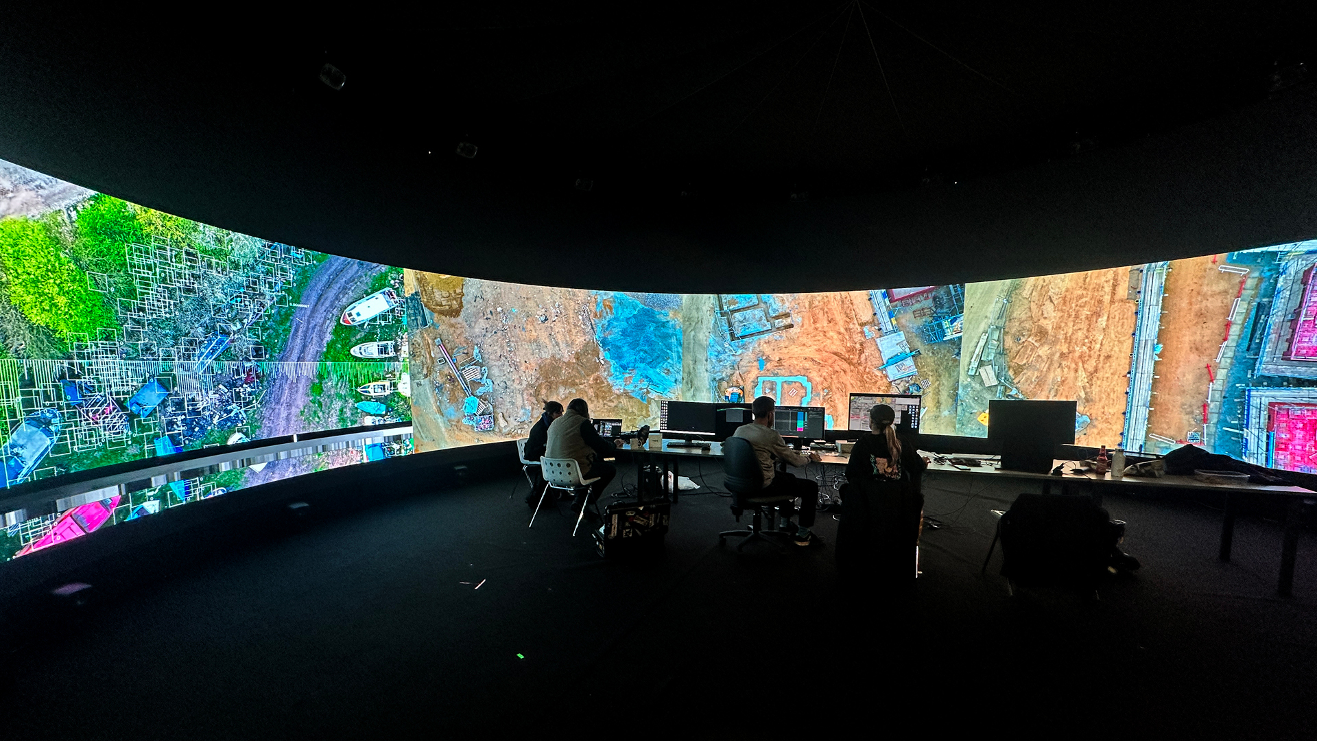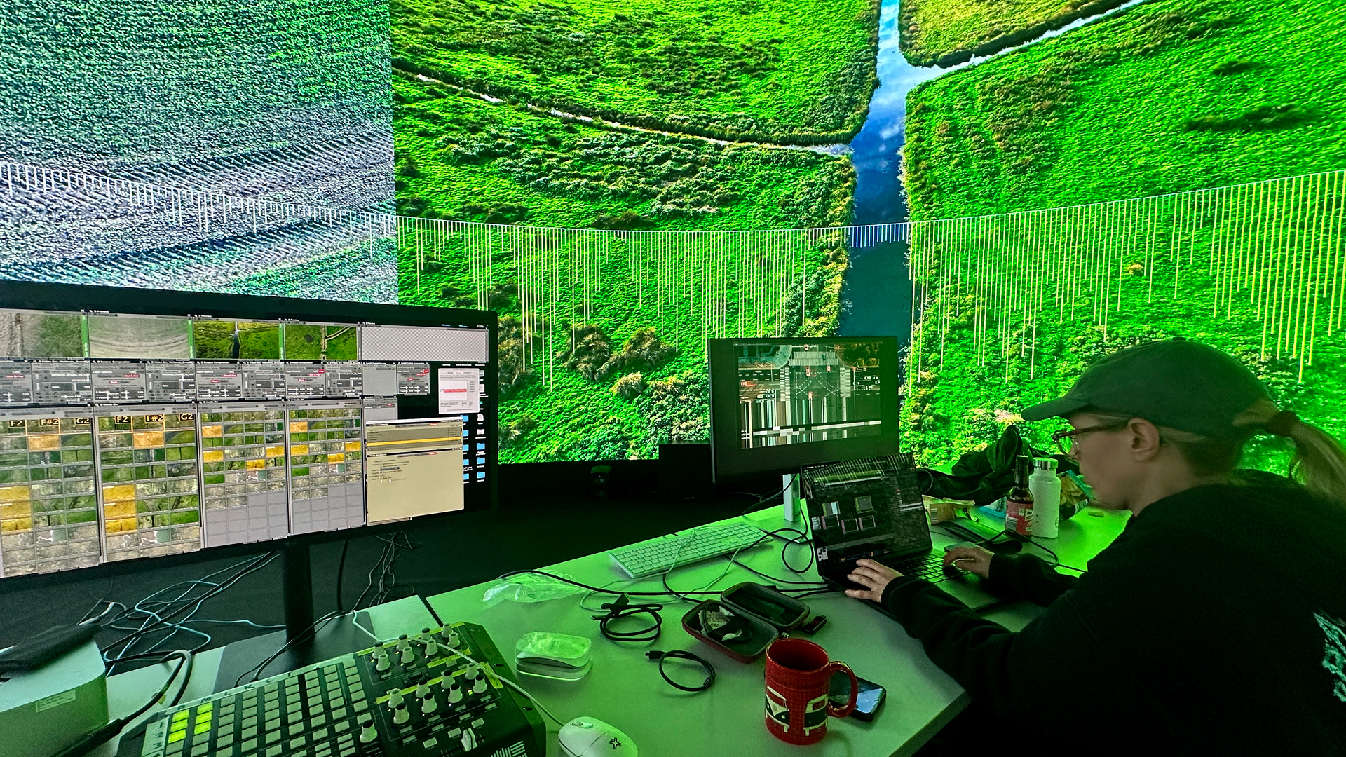 – VDMX and TouchDesigner were used to process the aerial footage and to perform different techniques, including depth mapping, blob tracking and extracting different real-time visual data (brightness, movement, colour temperature) that was sent as data to an Ableton. Both software platforms were also used to explore different visualisations of this process to give audience feedback.