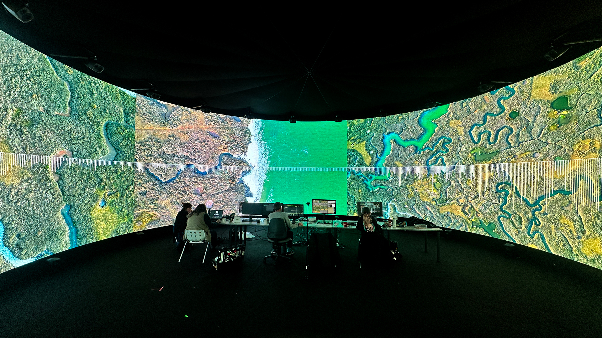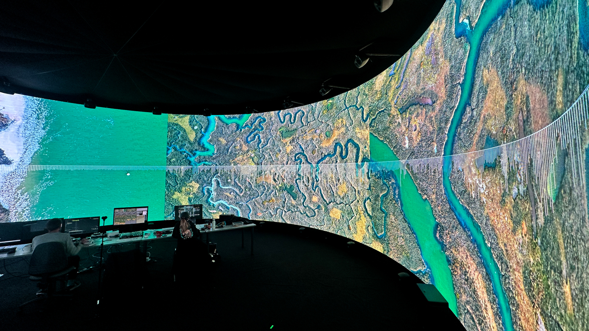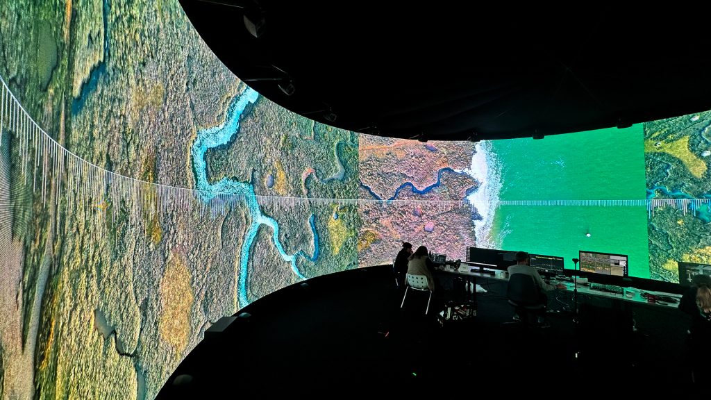 Their research explored different digital approaches to forming new relationships between landscape and music in the IVSL space that intersected with a set of questions: How might we explore the relationship between landscape and music in a generative way? What might we discover about these different topologies by translating them into sound? What footage and musical interjections work on their own and in the immersive 360 audio setup in IVSL space? How might we make this sonification process visually readable to an audience?