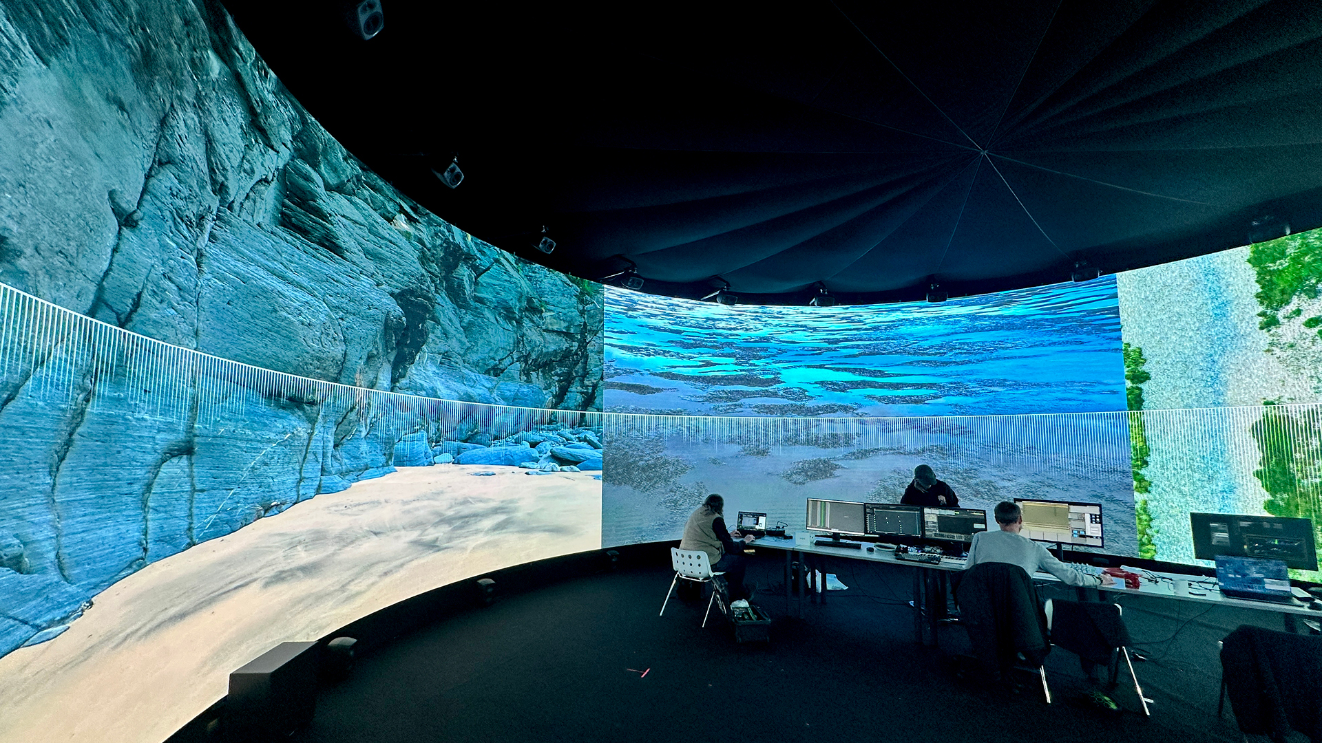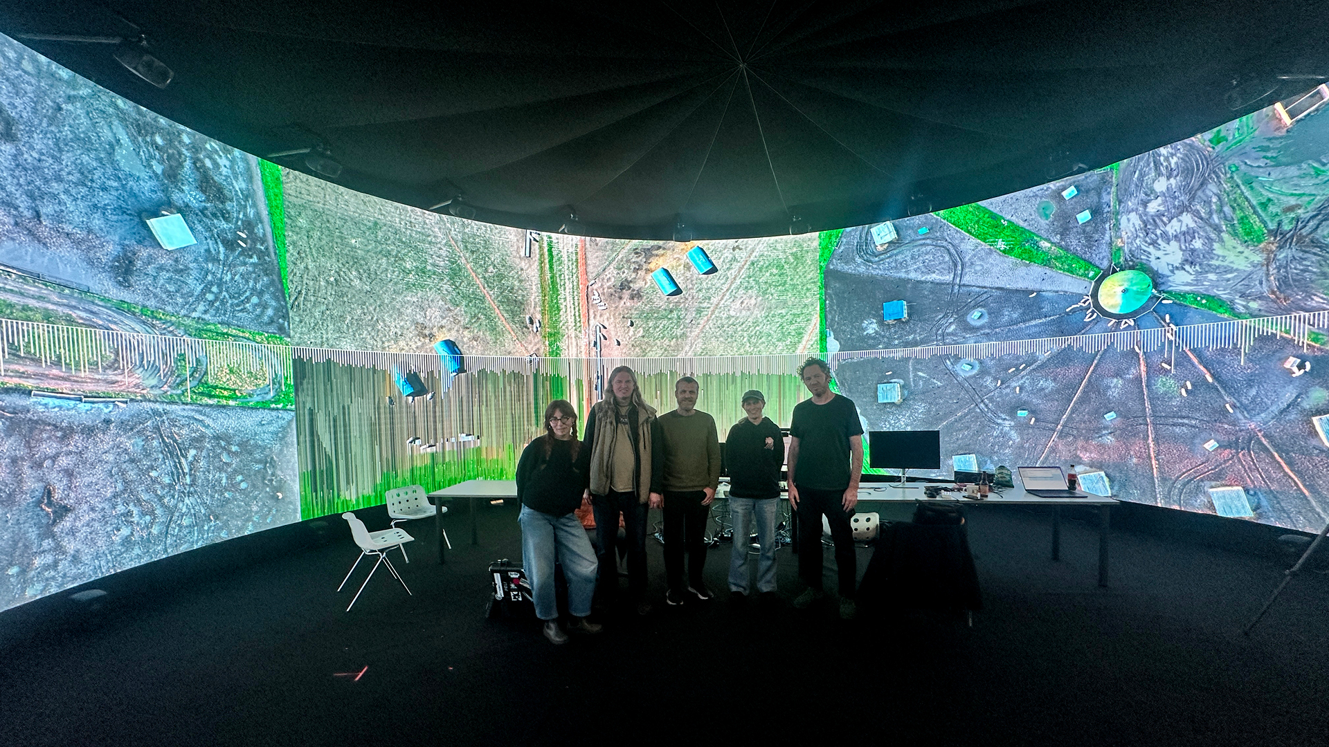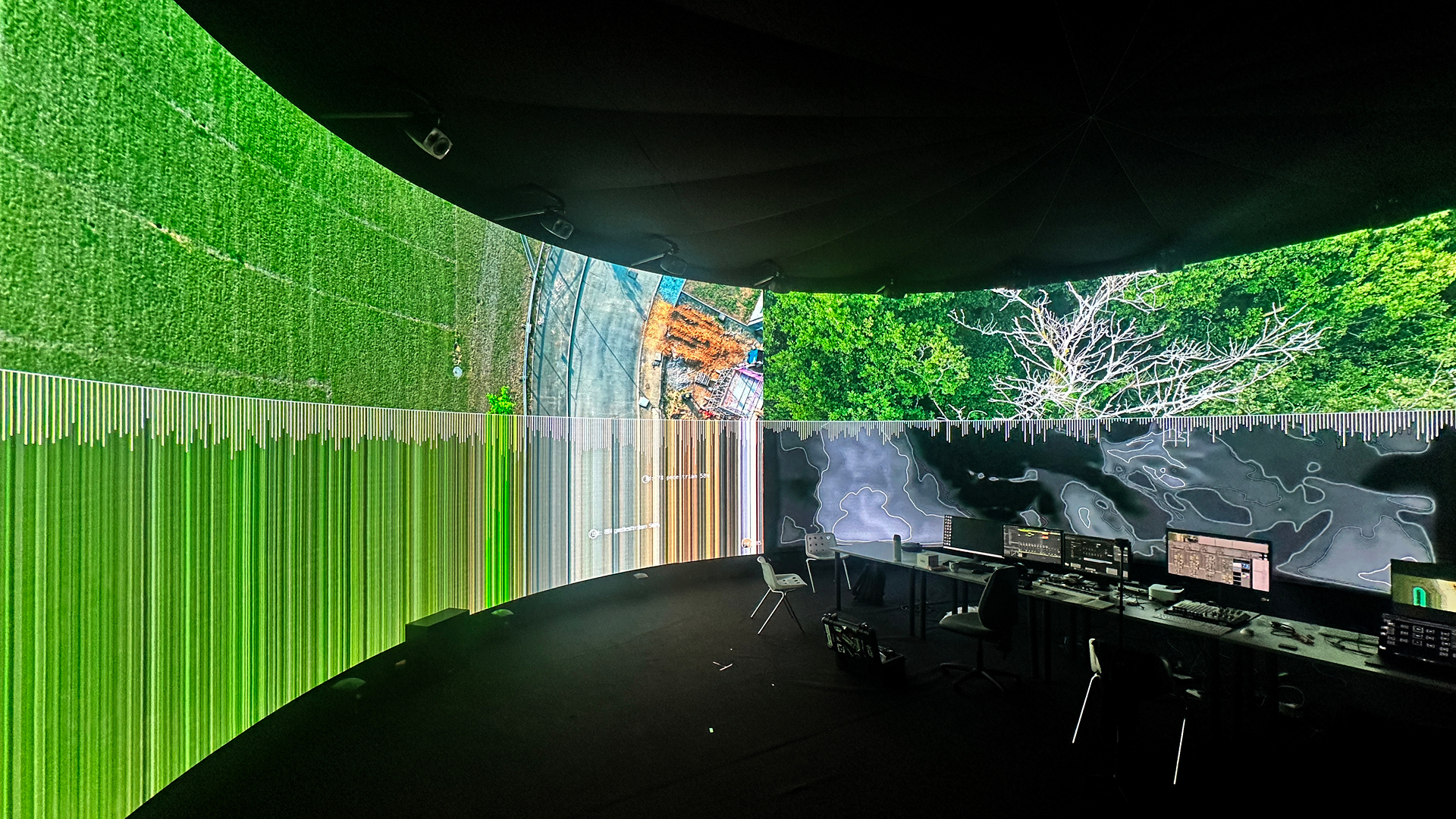 Their research explored different digital approaches to forming new relationships between landscape and music in the IVSL space that intersected with a set of questions: How might we explore the relationship between landscape and music in a generative way? What might we discover about these different topologies by translating them into sound? What footage and musical interjections work on their own and in the immersive 360 audio setup in IVSL space? How might we make this sonification process visually readable to an audience?