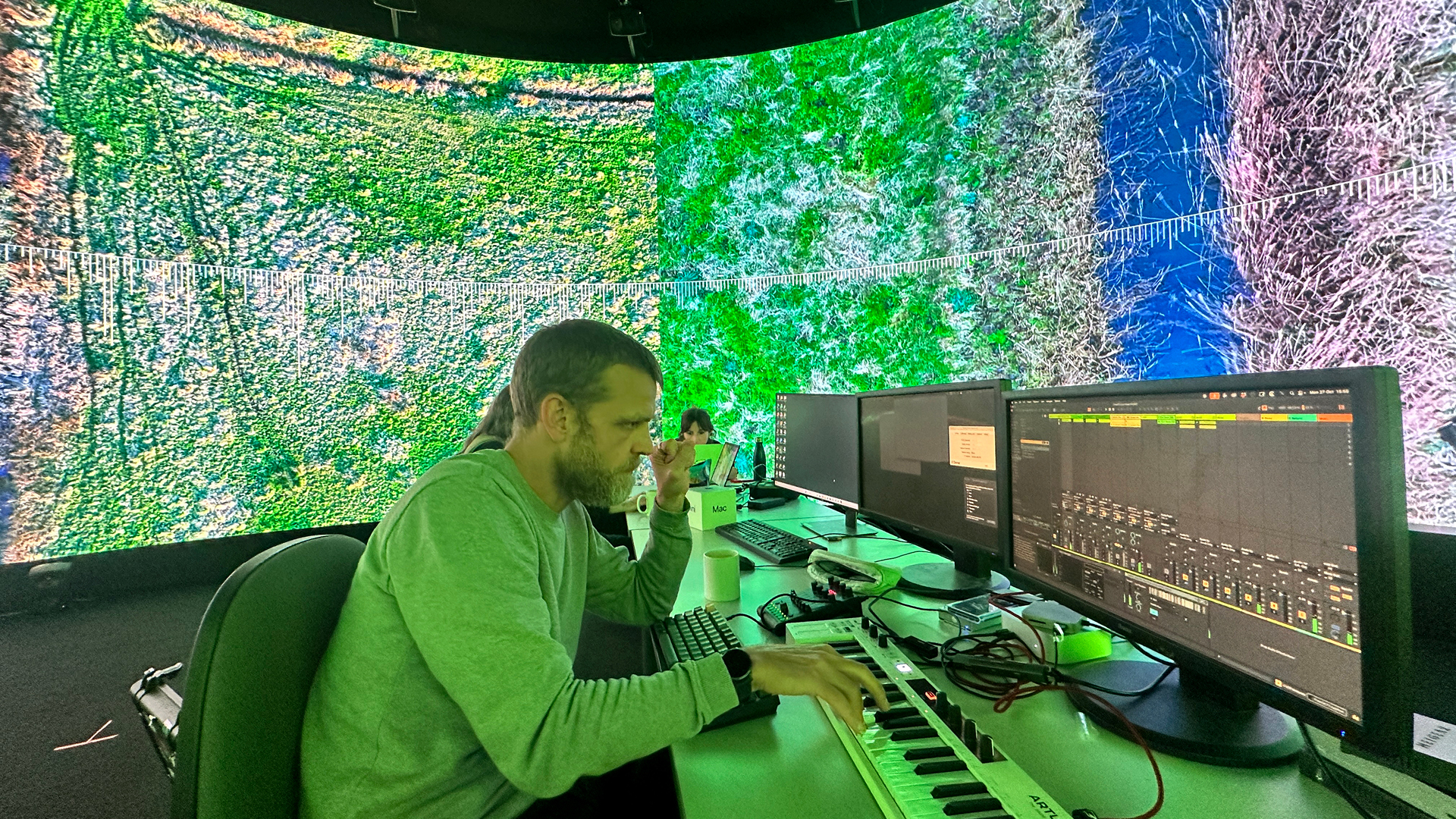 In 2025 project was developed further through a Research Fellowship in the Institute for Creative Technologies at Norwich University of the Arts. Allen invited long-time collaborator, artist and composer Tim Cowie into the work on this idea with him. Together, Allen and Cowie developed systems for the development of this sonification work. In late 2025, with some additional technical consultancy from Media Artist Marcus Lyall, they invited Touch Designer creative developer Cécile Lebon into the project to test ways to build custom plugins and send data from VDMX to Ableton. During its testing in the IVSL space at NUA the project also received additional technical support from creative technologist Richard Hall and Roz Gardner from Collusion, as well as advice and support from Norwich University of the Arts senior Technician and lecturer in sound, Dr Philip Archer on Max for Live and the cracking open of Meta-Synth plugins.