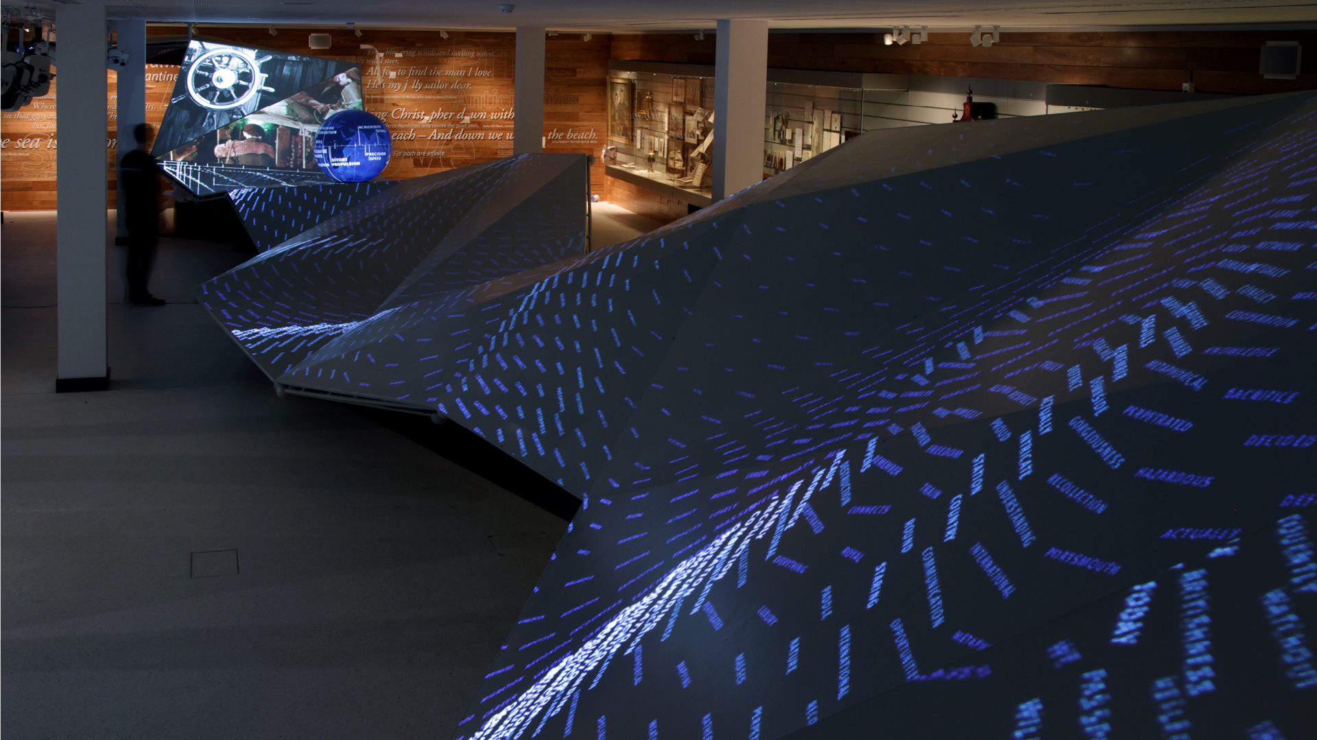 “Voyagers” was a large-scale audio-visual installation we created for the National Maritime Museum’s Sammy Ofer Wing. This gallery acted as an introduction to the extraordinary depth and range of the Museum’s collections. The space was dominated by a 20-metre wave-like structure that stretched the room’s full length was made up of 26 triangular facets and featured a Pufferfish spherical projector at one end.